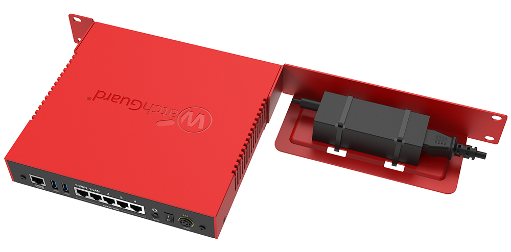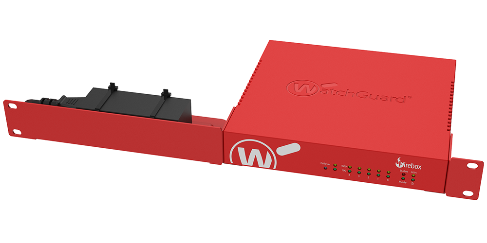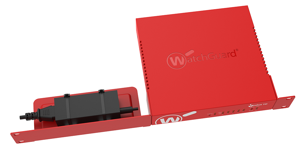 The optional rack mount installation kit (WG9023) enables you to install a rack mount bracket on the front or rear of the Firebox for installation in a network rack. The bracket also includes a shelf for the Firebox power adapter.